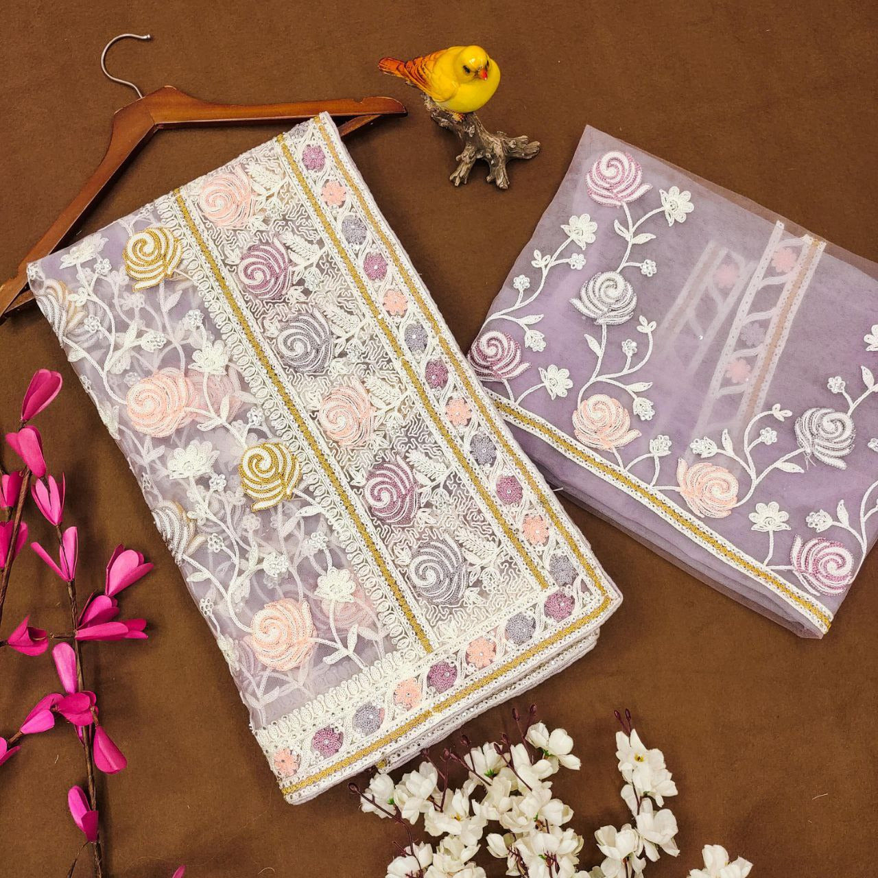 Design: Allover multicolor floral thread embroidery with intricate lace border for a graceful finish